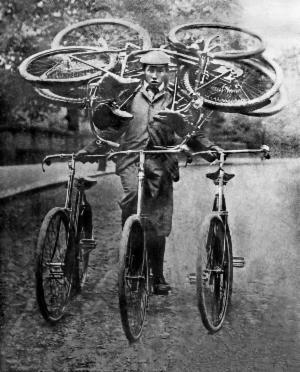 ![]() | 23/62012 This is John Markham, mentioned in the Cycling poem above. In a competition to celebrate Queen Victoria's Diamond Jubilee, he demonstrated his skill by riding on a bicycle while carrying five other bicycles at the same time. This is the restored version of the photograph. And below is the poem recording the event.. |