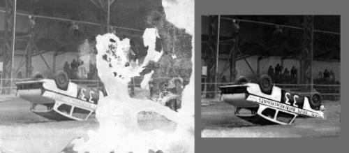 ![]() | | 12/6/2012 In stock car restoration, you expect a bit of damage But you don't expect water damage to the photos of your car. We were able to return the photo to an as-new condition. We weren't able to do the same for the car itself ! But note how we were able to "draw" in background to replace the lost areas. |