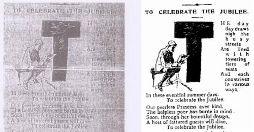 TO CELEBRATE THE JUBILEE The day draws nigh, the busy streets Are lined with towering tiers of seats, And each one strives in various ways, In these eventful summer days, To celebrate the Jubilee. Our peerless Princess ever kind, The helpless poor has borne in mind, Soon through her bountiful design, A host of fattened guests will dine, To celebrate the Jubilee The Scots are tearing limb from limb, The Bishop who composed the Hymn; Like bulls enraged by crimson rag They tatter poor old "England's flag" To celebrate the Jubilee. | The worthy major of Coventry - Home of the cycle industry - Will offer to our gracious Queen An exquisitely-wrought machine, To celebrate the Jubilee. Near "Cycling's" stately pile, the streets Were late the scene of skilful feats, When Markham rode, mid lively scenes, And won the prize with five machines, To celebrate the Jubilee. On Derby Day to Epsom Downs, In wondrous hats and stylish gowns The lady cyclists came in force And rode upon the famous course, To celebrate the Jubilee. | The constables of Portsmouth, too, Preparing for the great Review, On cycles mounted, through the streets Will pedal up and down their beats, To celebrate the Jubilee. Young Sloper found two stylish mounts Which no one lost, by all accounts; He failed to satisfy the "beak" - In breezy Pentonville next week He'll celebrate the Jubilee. To "Cycling's" readers great and small - Good luck attend you, one and all; May all who read this simple rhyme, Have what is termed a high old time To celebrate the Jubilee. Wm. C Birt Whitwell |