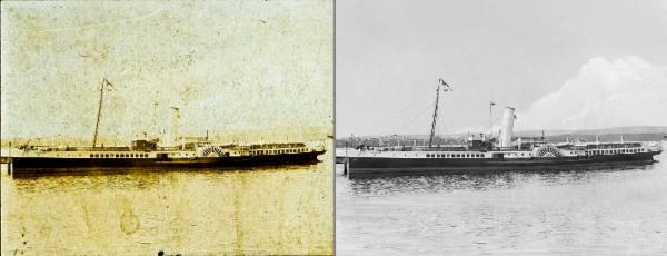 ![]() | 6/7/2012 It is not only photos of people which benefit from digital photo restoration. This photo was owned by a collector of photos of paddle steamers of a certain vintage. After restoration, not only was he able to see the detail of the steamer more clearly, but he was able to see the land features and make a good guess about the probable location. The photo was a 2.5 x 3.75inch glass slide. |